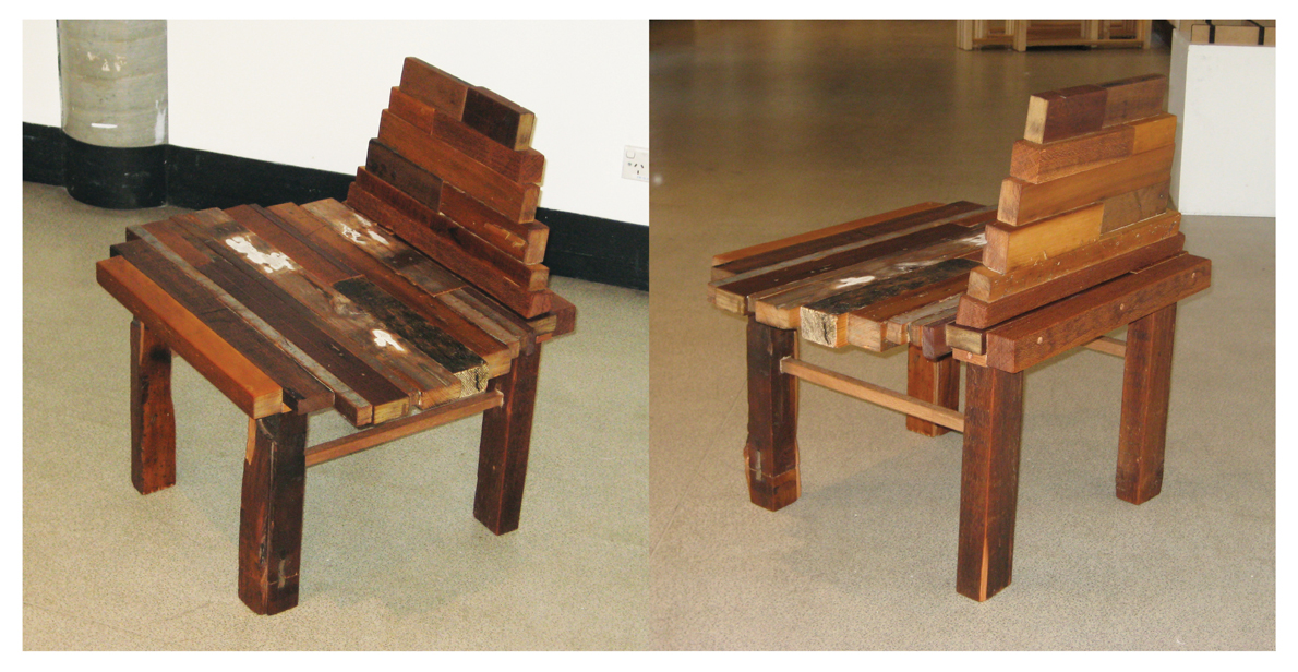 “Relaxation as a state of mind”; one must be prepared to let go of their worries and stresses in order to feel peace and calm. Is sitting required for relaxation to take place? Are they intrinsically liked? It can be active or passive: riding a bike or sitting at home. Where does the chair fit into this picture? Historically in cultures such as Japan and India people have sat and relaxed on the ground. In fact any object of scalable height can be used as a chair; walls, rocks, trees, etc. The form of the chair is inspired by the human body sitting cross-legged. It is constructed entirely from reclaimed timbers and appears to have grown from a pile of wood. The seat is large enough that one can sit with legs crossed and the backrest can be adjusted or removed.
